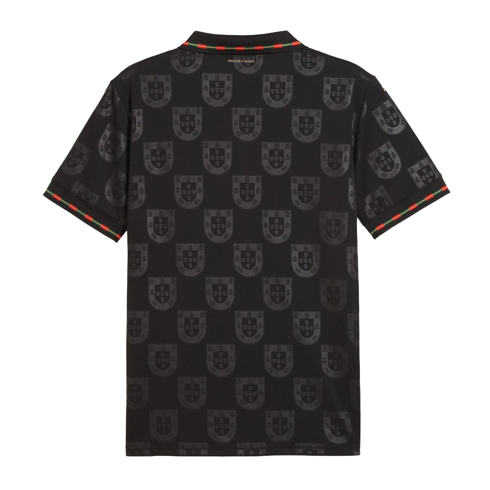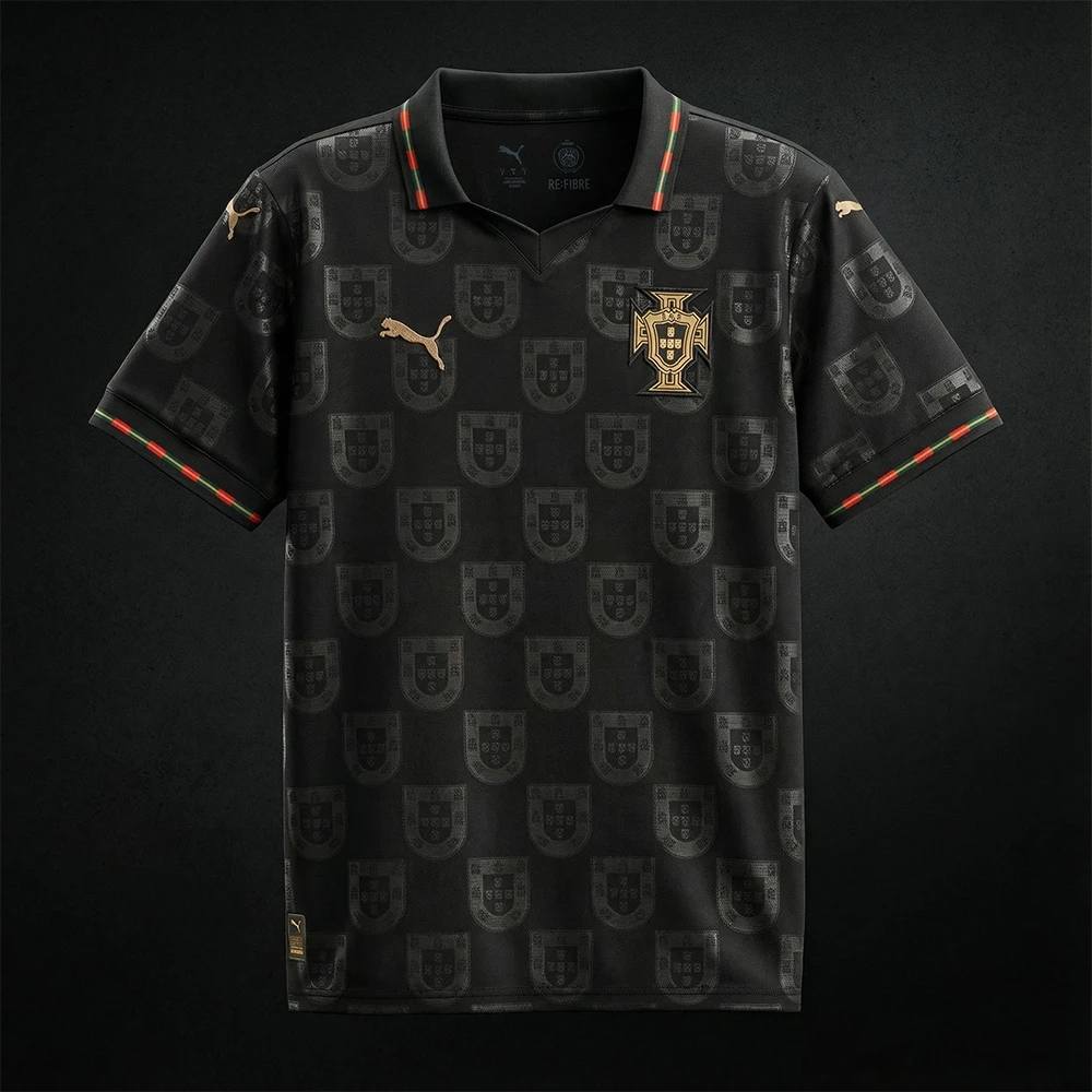 • Shirt Design: The shirt is predominantly black with a tonal pattern of the historic Portuguese shield and details in green, red and gold.